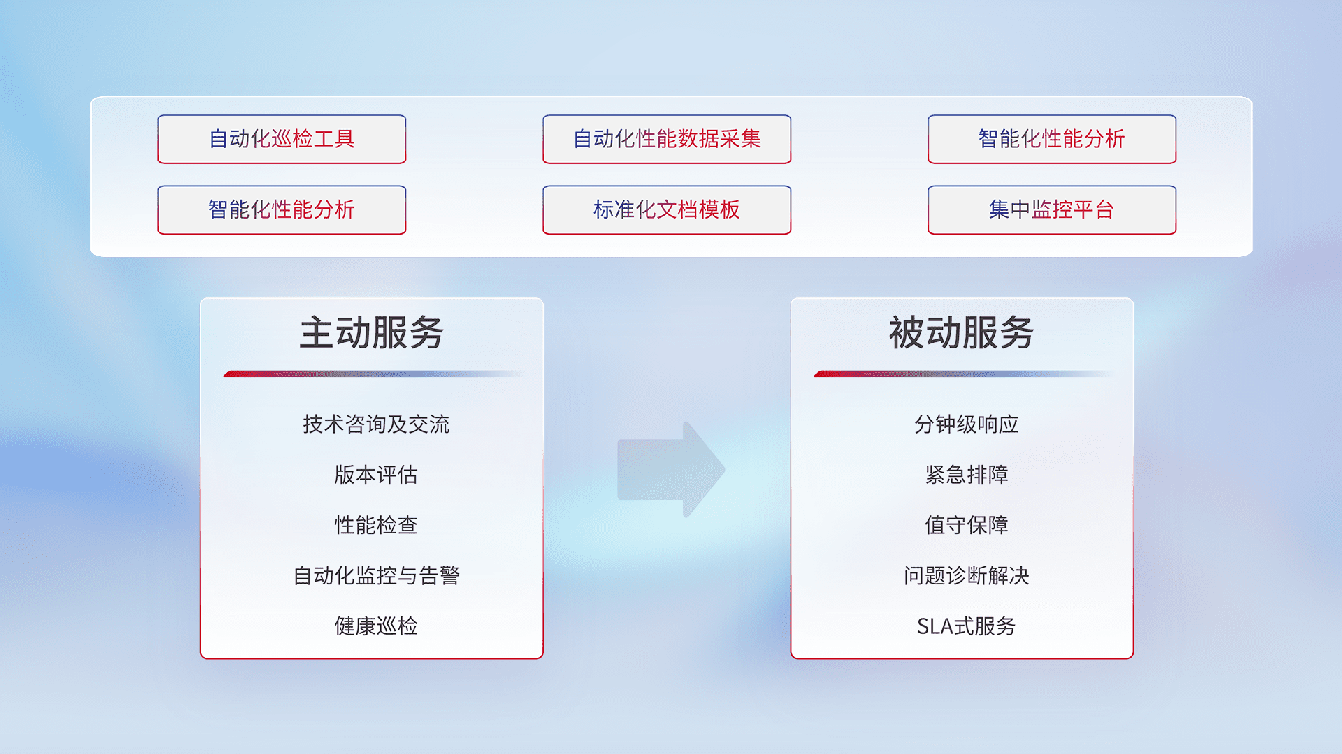 智能化工具和标准化文档,,,,保障服务质量,,,提供主动服务(包含技术咨询、、、版本评估、、、性能检查、、、、自动化监控与告警、、、健康巡检)和被动服务包含(分钟级响应、、紧急排障、、、、值守保障、、问题诊断解决、、SLA服务)。。。。